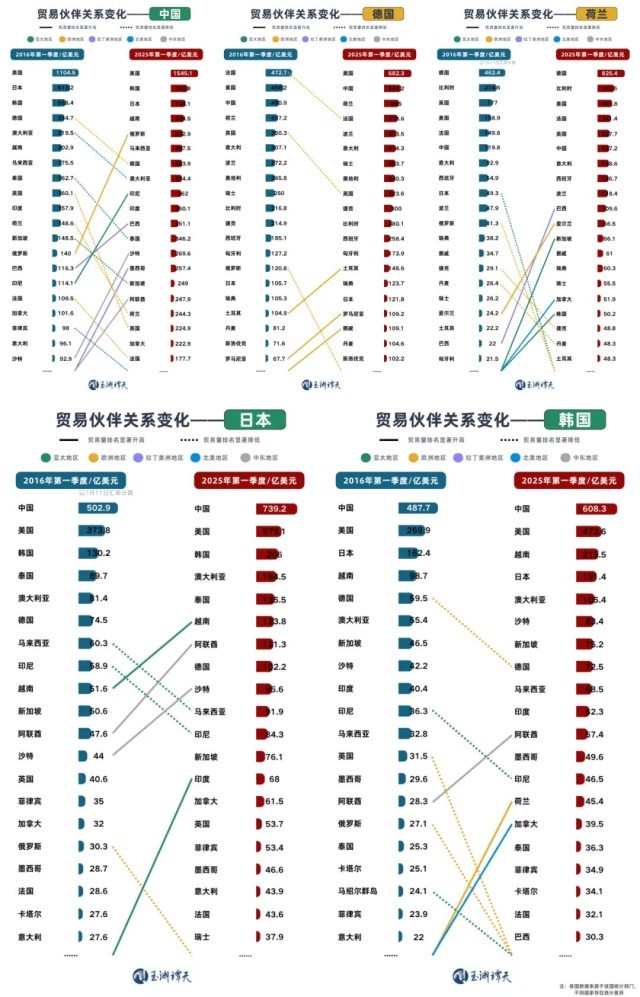 正在几张图中很是凸起,由于只要它的变化是单色的,这表白次要商业伙伴的变化集中正在欧洲内部。